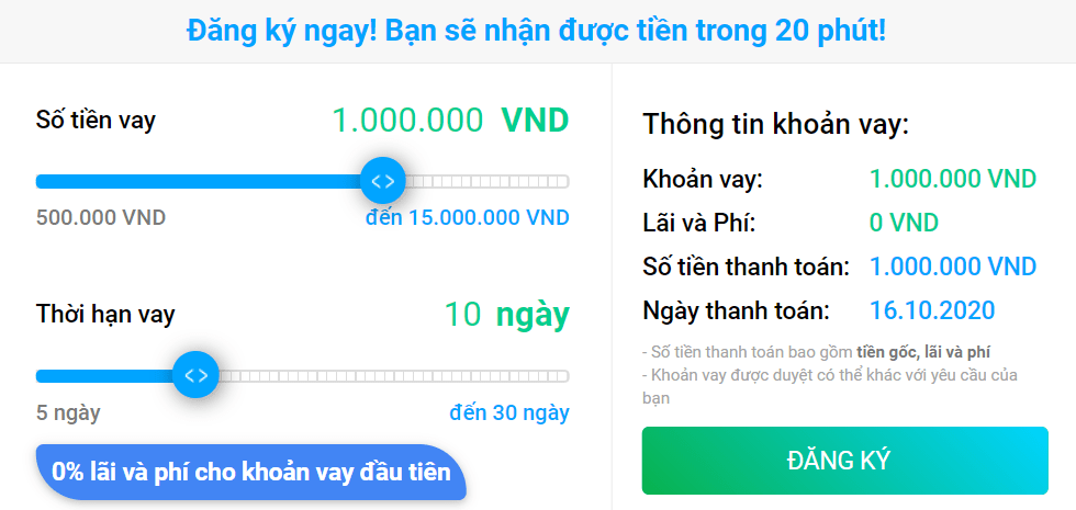 Bạn được vay ONLINE từ 1 đến 10 triệu ngay trong ngày, không cần chứng minh thu nhập. Hồ sơ vay đăng ký đơn giản và xét duyệt hoàn toàn online.